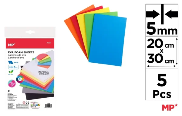 Accueil>Jeux éducatifs faits à la main>Papier artisanal en sachet>MOUSSE EVA 5 mm 5 Unités 20 x 30 cm.