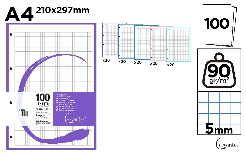 RECHARGE A4 QUADRILLAGE 5 x 5 mm COULEUR